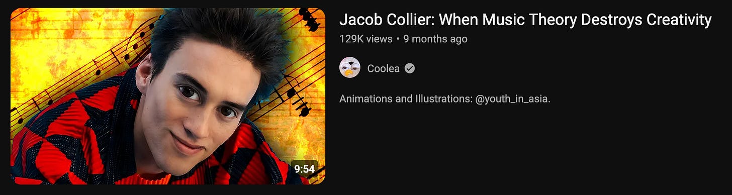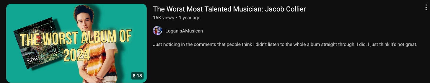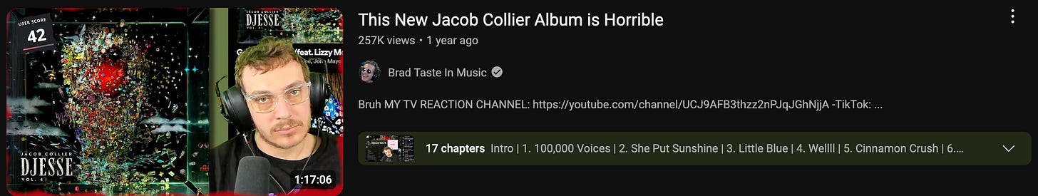 All this goes to show that tastes change, and lot of criticism often comes down to “this isn’t my style.” Jacob Collier writes complex, maximalist music. If you prefer The Clash, that’s fine! Art can be anything! Why should everything be reduced to its starkest possible form? Why not have fun with abundance and flourishes and what the grammarians used to call copia? Occasionally, less is more. More often, more is more.